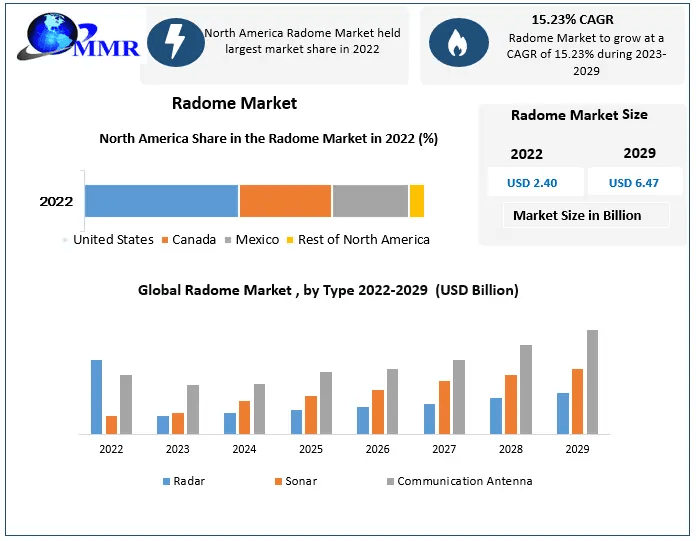 Global Radome Market size was valued at USD 2.40 Bn in 2022 and is expected to reach USD 6.47 Bn by 2029, at a CAGR of 15.23 % from the forecast period (2023 to 2029)